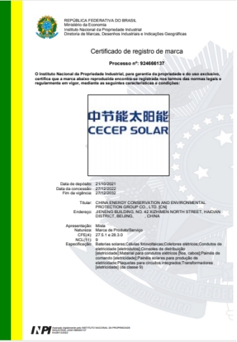 太陽(yáng)能公司下屬鎮(zhèn)江公司“中節(jié)能太陽(yáng)能 CECEP SOLAR”商標(biāo)在巴西成功注冊(cè) |
