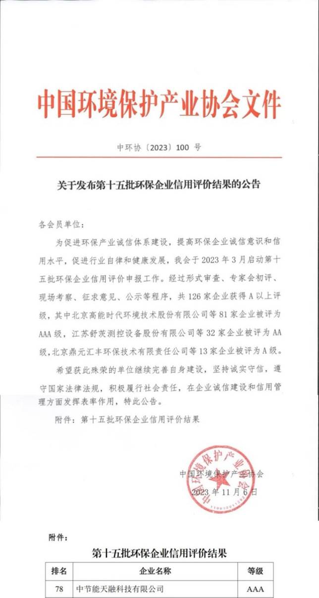 近日,中節(jié)能大數(shù)據(jù)有限公司下屬中節(jié)能天融科技有限公司成功通過(guò)中國(guó)環(huán)境保護(hù)產(chǎn)業(yè)協(xié)會(huì)第十五批環(huán)保企業(yè)信用評(píng)價(jià),獲評(píng)最高信用等級(jí)(AAA級(jí))信用企業(yè)。