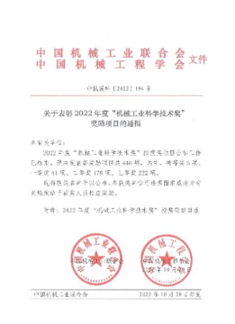 機械工業(yè)科學技術獎是經(jīng)國家科學技術部批準,在國家科技獎勵主管部門注冊,由中國機械工業(yè)聯(lián)合會和中國機械工程學會共同設立,面向全國機械工業(yè)的綜合性科技獎項。