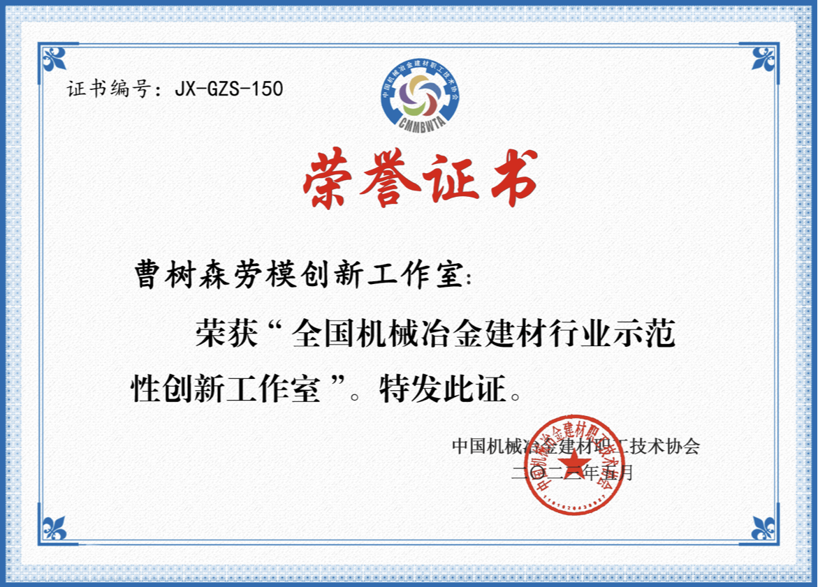 近日,中國機械冶金建材職工技術(shù)協(xié)會表彰了一批先進(jìn)集體和個人,下屬子公司啟源裝備“曹樹森勞模創(chuàng)新工作室”被命名為“全國機械冶金建材行業(yè)示范性創(chuàng)新工作室”,這是該工作室相繼被中國節(jié)能集團(tuán)、西安市政府命名“勞模創(chuàng)新工作室”后,再次喜獲殊榮。