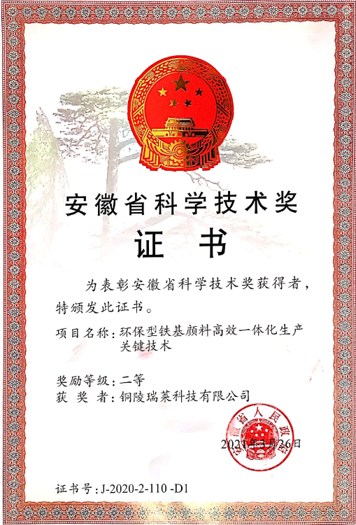 近日,安徽省科技廳發(fā)布了2020年安徽省科學(xué)技術(shù)進(jìn)步獎獲獎名單,重慶公司所屬的銅陵瑞萊科技有限公司報送的《環(huán)保型鐵基顏料高效一體化生產(chǎn)關(guān)鍵技術(shù)》項(xiàng)目榮獲2020年安徽省科技進(jìn)步二等獎。