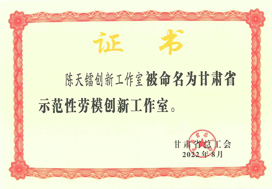 2022年8月,甘肅省總工會發(fā)布《關(guān)于命名第四批甘肅省示范性勞模創(chuàng)新工作室的決定》(甘總工法〔2022〕50號),命名蘭冶院陳天鐳創(chuàng)新工作室為“甘肅省示范性勞模創(chuàng)新工作室”。