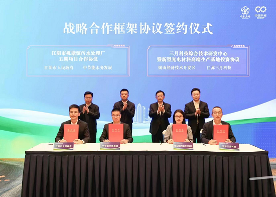 簽約儀式上,中節(jié)能水務(wù)發(fā)展有限公司和江陰市政府簽訂城鎮(zhèn)污水處理合作協(xié)議,江蘇三月科技股份有限公司和錫山區(qū)政府簽訂新型光電材料高端生產(chǎn)基地建設(shè)項(xiàng)目合作協(xié)議,中節(jié)能鐵漢生態(tài)環(huán)境股份有限公司和無錫市環(huán)保集團(tuán)有限公司簽訂戰(zhàn)略合作框架協(xié)議,中節(jié)能節(jié)能科技東南分公司和中國移動(dòng)通信集團(tuán)江蘇有限公司無錫分公司簽訂機(jī)房余熱回收利用項(xiàng)目合作協(xié)議。