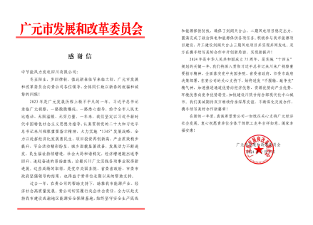 近日,風(fēng)電西中區(qū)域公司所屬中節(jié)能風(fēng)力發(fā)電四川有限公司收到來(lái)自四川省廣元市發(fā)展和改革委員會(huì)的感謝信。