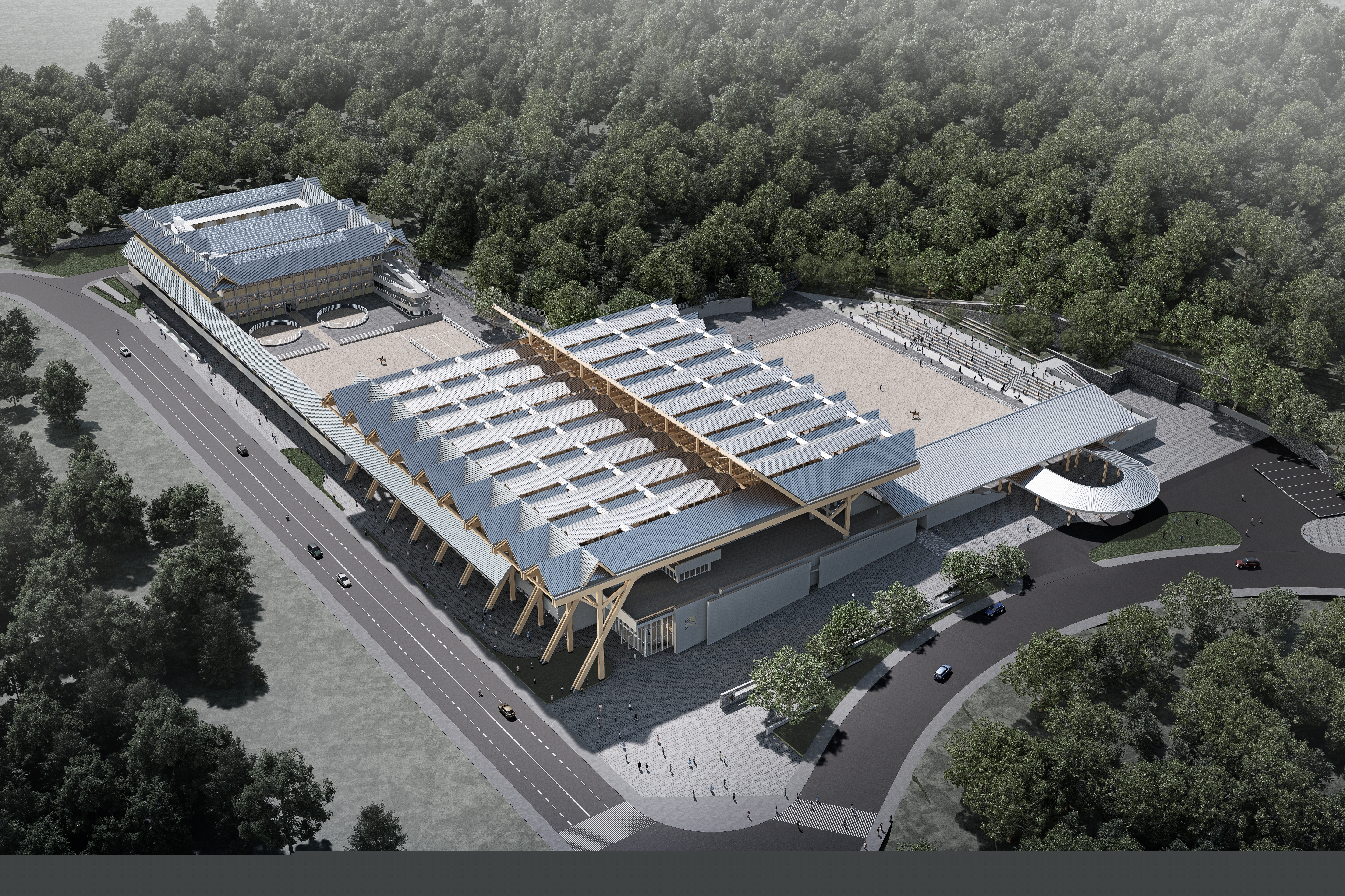 項目位于深圳市光明區(qū)光明街道,總建筑面積69000平方米,定位為符合國際馬術五星級賽事標準的永久性場館,包括主賽場、室內(nèi)訓練館、室外訓練場、賽事用房及馬匹生活用房等。