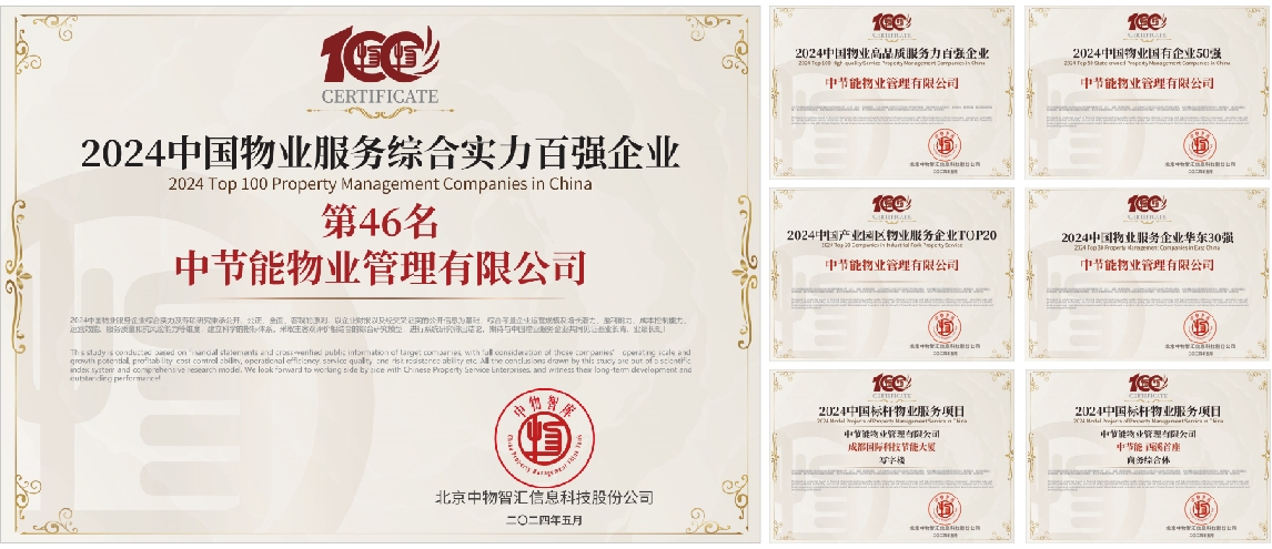 中節(jié)能實業(yè)下屬物業(yè)公司榮膺“2024中國物業(yè)服務綜合實力百強企業(yè)第46名”等六大獎項 |
