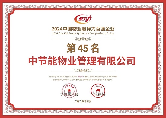 中節(jié)能實(shí)業(yè)公司下屬物業(yè)公司榮膺“2024中國(guó)物業(yè)服務(wù)力百?gòu)?qiáng)企業(yè)第45名”等八大獎(jiǎng)項(xiàng) |