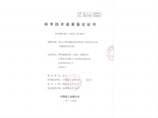 此次成果鑒定會由中國輕工業(yè)聯(lián)合會組織。中華中醫(yī)藥學(xué)會、中國醫(yī)學(xué)科學(xué)院藥用植物資源研究所、清華大學(xué)附屬北京清華長庚醫(yī)院、中國農(nóng)業(yè)大學(xué)、中國農(nóng)業(yè)科學(xué)院等不同研究領(lǐng)域的專家出席會議并對《基于中國瑪咖性味歸經(jīng)的產(chǎn)品創(chuàng)制與評價關(guān)鍵技術(shù)及應(yīng)用》科學(xué)技術(shù)成果給予高度評價,認(rèn)為該項目達到了國際領(lǐng)先技術(shù)水平。 此項成果由健康產(chǎn)業(yè)公司子公司國珍健康科技(北京)有限公司、中國食品發(fā)酵工業(yè)研究院、北京中醫(yī)藥大學(xué)、江南大學(xué)四家科研單位共同完成。獲得此項殊榮表明,健康產(chǎn)業(yè)公司在推動瑪咖“中藥化”過程中做出了突出的貢獻,賦予了瑪咖中藥藥性(甘、辛,微溫,歸腎、肝、脾經(jīng)),明確了外來植物瑪咖的潛在功效(健脾益氣、補腎益精、疏肝解郁)及其物質(zhì)基礎(chǔ)。健康產(chǎn)業(yè)公司依托瑪咖中藥藥性的研究成果,基于中藥方劑君臣佐使配伍理論,創(chuàng)制了多款瑪咖營養(yǎng)健康食品,取得了顯著的經(jīng)濟和社會效益。