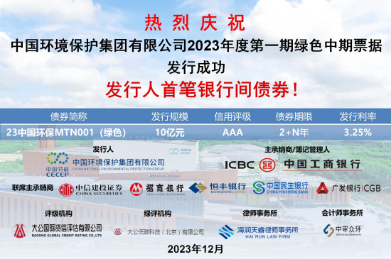 12月5日,中國環(huán)保成功在銀行間發(fā)行2023年度第一期綠色中期票據(jù),這是公司首次公開在市場亮相發(fā)行債券。