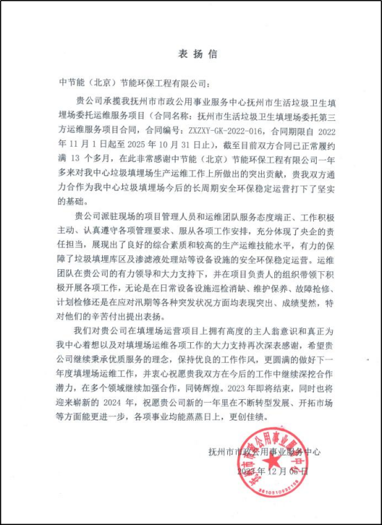 信中表示,自2022年11月1日起承接撫州市生活垃圾衛(wèi)生填埋場(chǎng)委托運(yùn)維以來,工程公司充分展現(xiàn)了中央企業(yè)的責(zé)任擔(dān)當(dāng),駐項(xiàng)目現(xiàn)場(chǎng)運(yùn)維團(tuán)隊(duì)擁有高度的主人翁意識(shí),認(rèn)真遵守各項(xiàng)管理要求,服從各項(xiàng)工作安排,展現(xiàn)出了良好的綜合素質(zhì)和較高的生產(chǎn)運(yùn)維技能水平,從多方面有力的保障了垃圾填埋庫區(qū)及滲濾液處理站等設(shè)備設(shè)施的安全環(huán)保穩(wěn)定運(yùn)營(yíng),同時(shí)也為后續(xù)的長(zhǎng)周期安全環(huán)保穩(wěn)定運(yùn)營(yíng)打下了堅(jiān)實(shí)的基礎(chǔ)。 撫州市生活垃圾衛(wèi)生填埋場(chǎng)是工程公司垃圾填埋場(chǎng)委托運(yùn)營(yíng)的首個(gè)外部市場(chǎng)項(xiàng)目。此項(xiàng)目在接手運(yùn)營(yíng)初期,存在一些急待解決的問題。面對(duì)困難,公司帶領(lǐng)項(xiàng)目團(tuán)隊(duì)積極應(yīng)對(duì),秉承優(yōu)質(zhì)服務(wù)的理念,優(yōu)良的工作作風(fēng),通過不斷的努力,鞏固安全環(huán)保的基礎(chǔ),確保填埋場(chǎng)的長(zhǎng)期安全和環(huán)保穩(wěn)定運(yùn)營(yíng)。 該項(xiàng)目為工程公司提供了展示專業(yè)技能和服務(wù)質(zhì)量的平臺(tái),為后期業(yè)務(wù)拓展創(chuàng)造了良好的條件。既是對(duì)工程公司專業(yè)技能和服務(wù)質(zhì)量的考驗(yàn),也是在外部市場(chǎng)的一次重要嘗試,有利于公司積累更多的運(yùn)維經(jīng)驗(yàn),進(jìn)一步強(qiáng)化在環(huán)保市場(chǎng)的影響力。