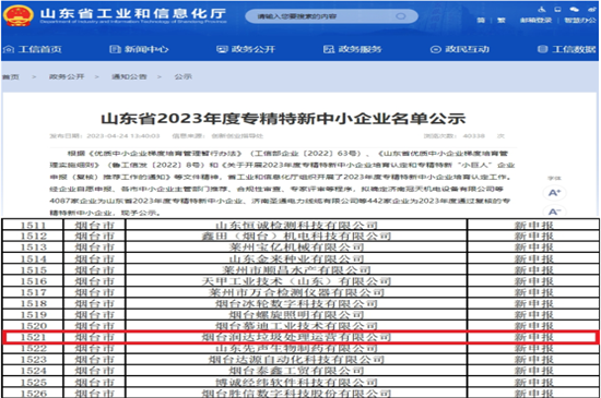 近日,山東省工業(yè)和信息化廳關(guān)于山東省2023年度專精特新中小企業(yè)名單公示,中國環(huán)保潤達(dá)運營公司榜上有名,獲得山東省“專精特新”中小企業(yè)稱號。