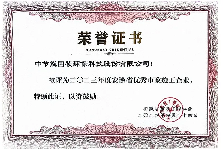中節(jié)能國禎獲2023年度“安徽省優(yōu)秀市政施工企業(yè)”稱號 |
