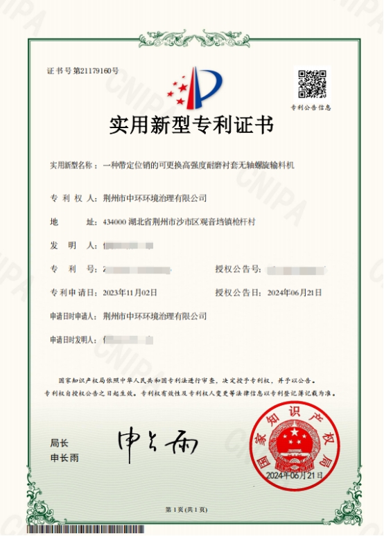近日,荊州公司科技創(chuàng)新項目《一種帶定位銷的可更換高強(qiáng)度耐磨襯套無軸螺旋輸料機(jī)》通過國家版權(quán)局審核,獲得實用新型專利證書。
