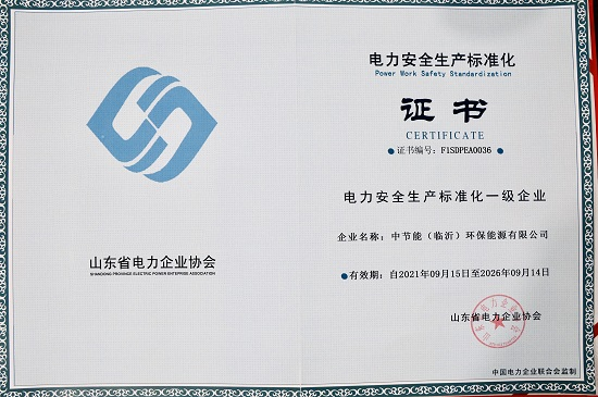 中國(guó)環(huán)保臨沂公司獲得山東省電力安全生產(chǎn)標(biāo)準(zhǔn)化一級(jí)企業(yè)證書 |