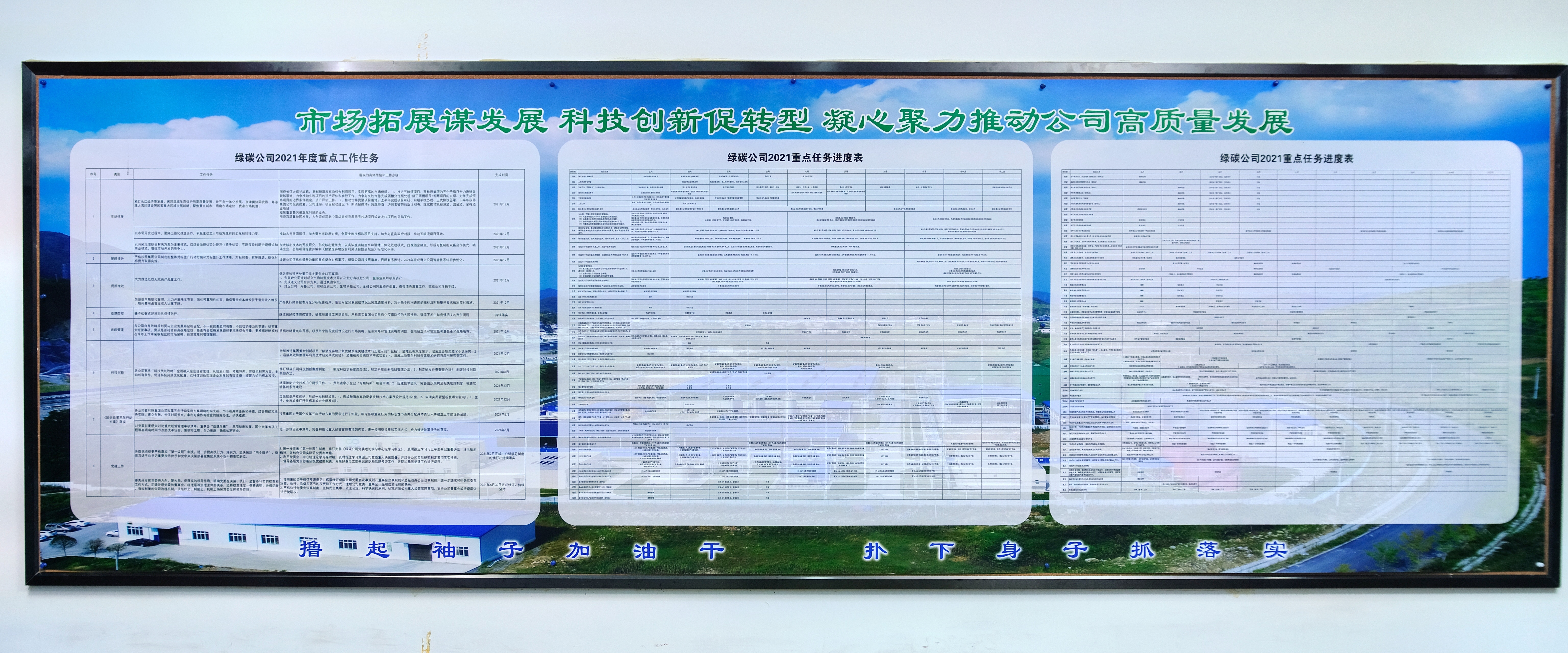 年初以來,綠碳公司黨委圍繞落實“黨建創(chuàng)新拓展年”、“市場拓展年”以及國企改革三年行動等工作,組織各業(yè)務部門和下屬子公司進行“二次籌劃”,對公司全年工作指標進行細化分解,把任務目標分解到月、細化到人,并列入公司周督辦事項,實行“領導包干”和“掛圖督戰(zhàn)”,切實以目標倒逼進度、以時間倒逼程序、以督辦倒逼落實。公司領導班子成員帶頭認領任務,帶頭開拓市場,帶頭狠抓落實,在公司上下營造“人人有責任、事事有人盯、時時抓落實”的真抓實干氛圍。同時,公司黨委結合開展“大干一季度,實現開門紅”活動,組織動員全體職工行動起來,鼓足干勁,真抓實干,奮力推動公司“十四五”規(guī)劃和年度“十大重點任務”加速落地。