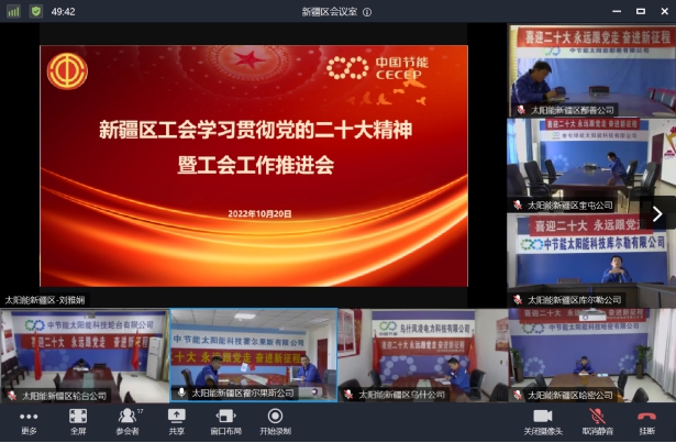 太陽能西中區(qū)、新疆區(qū)為深入學(xué)習(xí)宣傳貫徹黨的二十大精神,近日,各基層工會(huì)召開學(xué)習(xí)貫徹黨的二十大精神暨工會(huì)工作推進(jìn)會(huì),集中學(xué)習(xí)黨的二十大報(bào)告,就學(xué)習(xí)貫徹好黨的二十大精神提出工作要求,并對(duì)下一階段工會(huì)工作進(jìn)行安排部署,在廣大干部職工中掀起學(xué)習(xí)討論熱潮。各級(jí)基層工會(huì)主席、委員參加會(huì)議。