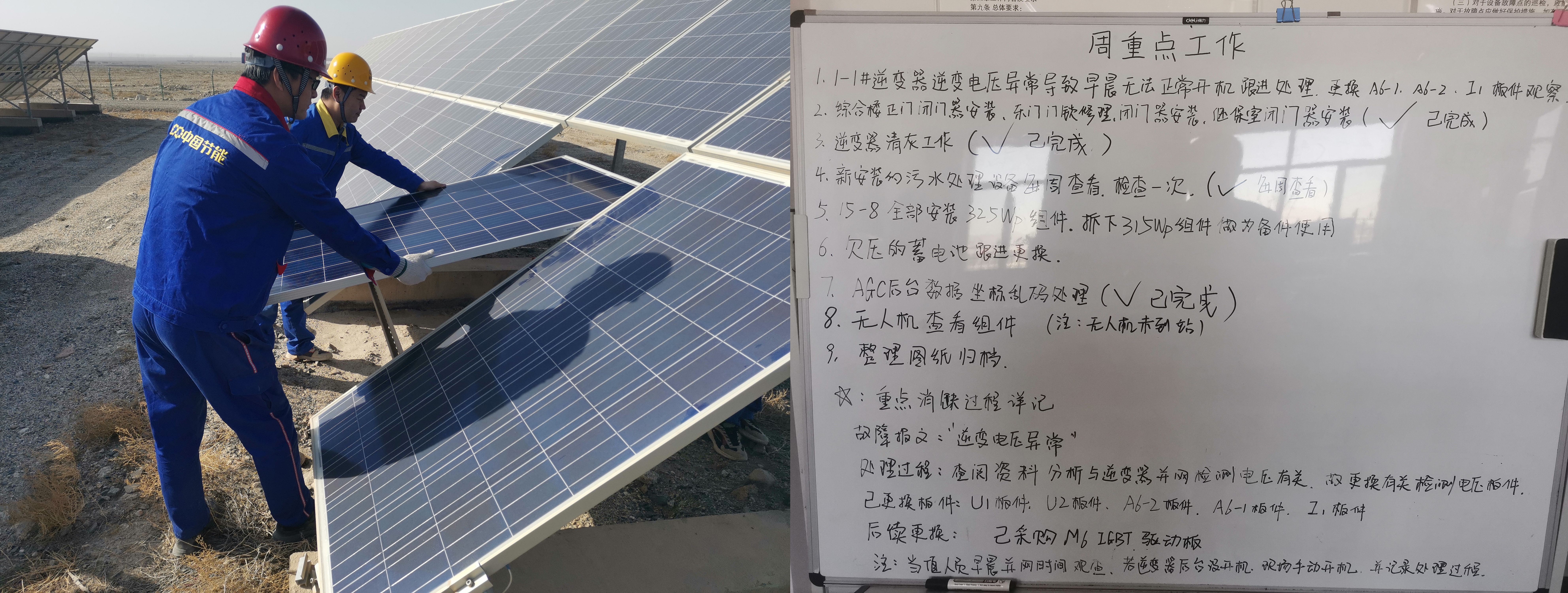太陽能新疆區(qū)黨總支掀起“鏖戰(zhàn)四季度,大干70天”熱潮,各電站黨員干部認(rèn)真商議,制定有效工作計劃,充分發(fā)揮員工主觀能動性,挖潛增效。 哈密公司運維團隊全力開展修舊利廢工作,對于長期高溫暴曬導(dǎo)致廠區(qū)組件焊點老化、虛焊脫焊等現(xiàn)象,班組長張波帶領(lǐng)班組成員開展了組件專項排故消缺工作,通過排查問題、檢測故障、更換低效能組件和破碎組件,自己動手焊接脫焊組件等一系列工作,組件問題得以解決,發(fā)電量顯著提升,每月可提升發(fā)電量約10萬度。 庫爾勒電站受疫情封閉影響,電站運維工作相對滯后,電站迅速成立黨團突擊隊,對發(fā)電設(shè)備、組件、高低壓開關(guān)柜、電力外送線路進(jìn)行了一次專項巡檢維護(hù),過程中共查找出37處設(shè)備故障問題隱患點。針對問題,突擊隊隊員隨即制定消缺方案,對故障問題進(jìn)行及時消缺,保障了電站設(shè)備的最大出勤率,電站設(shè)備安全性進(jìn)一步提高,發(fā)電量也有了大幅度提升。 11月初,為順利完成完成新疆電力公司二次網(wǎng)絡(luò)安防整改要求,庫爾勒公司黨團突擊隊協(xié)同廠家連續(xù)奮戰(zhàn)18小時,在規(guī)定時間內(nèi)完成所有整改項目,有效避免了電站被拉停,減少了發(fā)電量損失,增加了經(jīng)濟效益,為電站順利完成年度發(fā)電量指標(biāo)奠定了堅實的基礎(chǔ)。 多措并舉顯成效 做好科技創(chuàng)新“領(lǐng)頭雁”