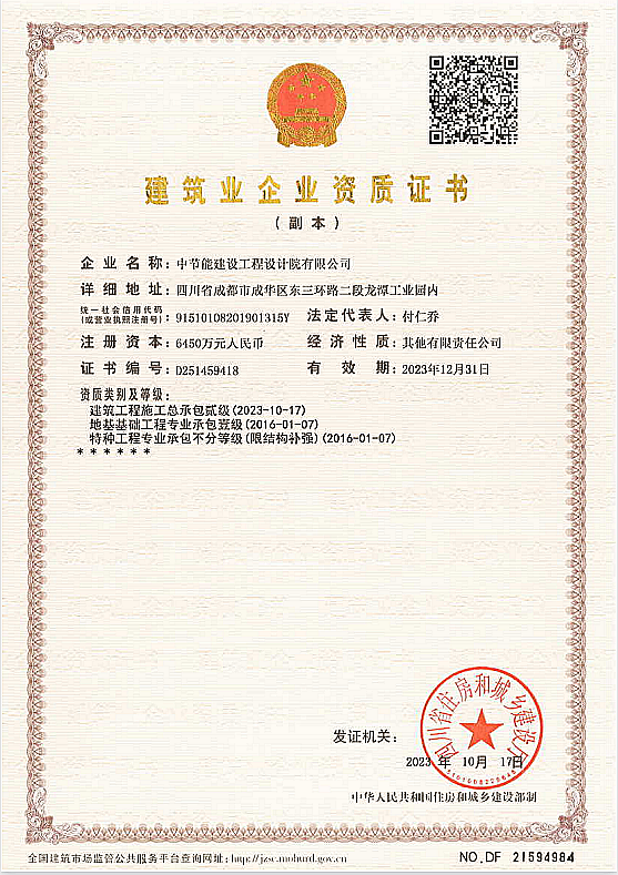 近日,經(jīng)過四川省住房和城鄉(xiāng)建設(shè)廳審核批準(zhǔn),中國啟源所屬中節(jié)能建設(shè)取得建筑工程施工總承包貳級資質(zhì)。
