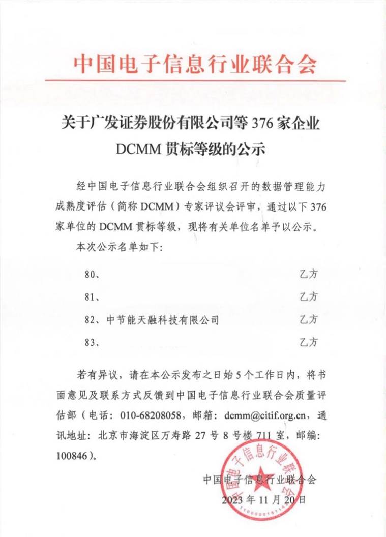 近日,中節(jié)能大數(shù)據(jù)有限公司下屬中節(jié)能天融科技有限公司(以下簡稱天融科技公司)成功通過中國電子信息行業(yè)聯(lián)合會數(shù)據(jù)管理能力成熟度評估(DCMM)等級認(rèn)證,獲評DCMM三級(穩(wěn)健級)資質(zhì)。